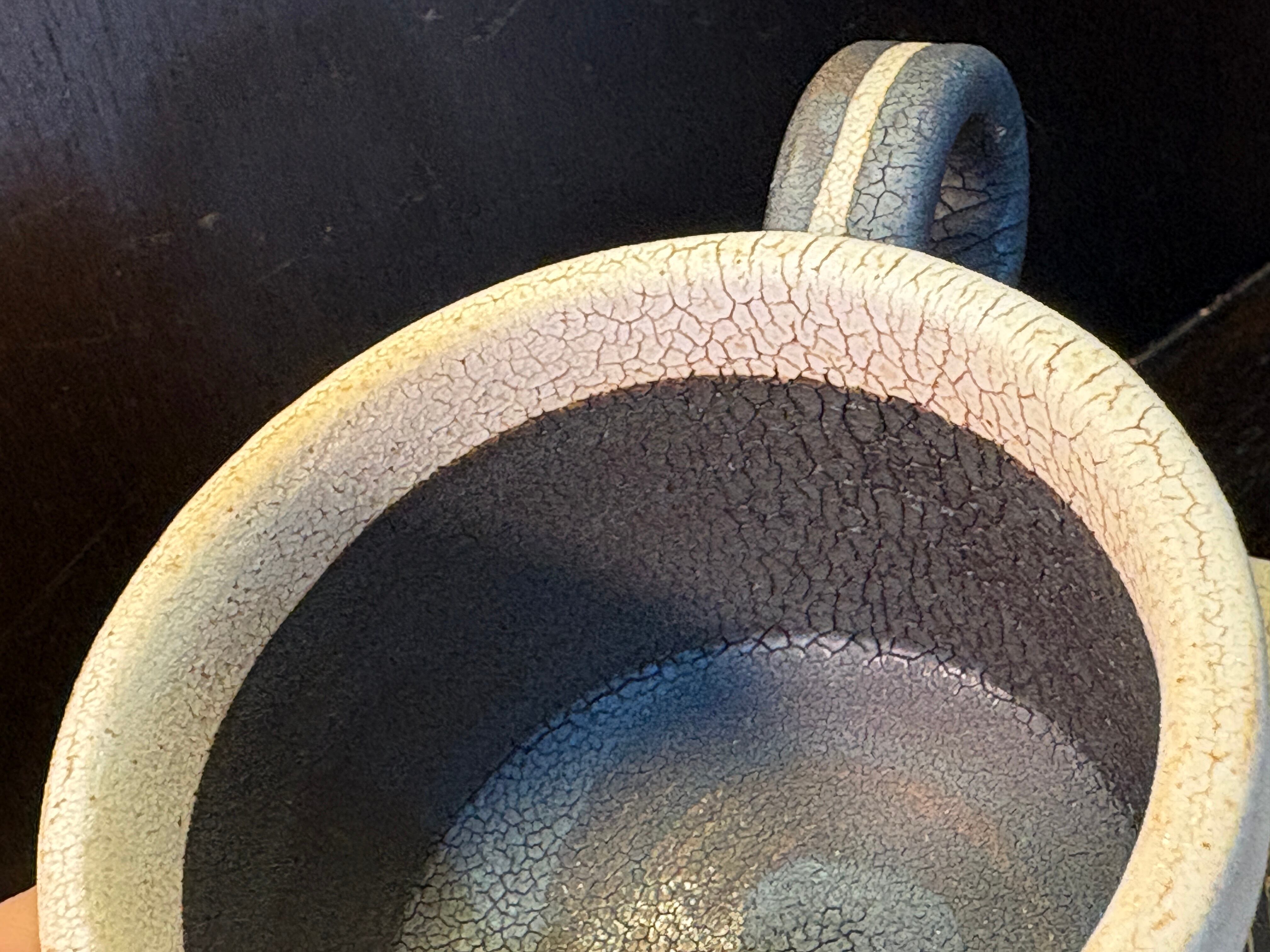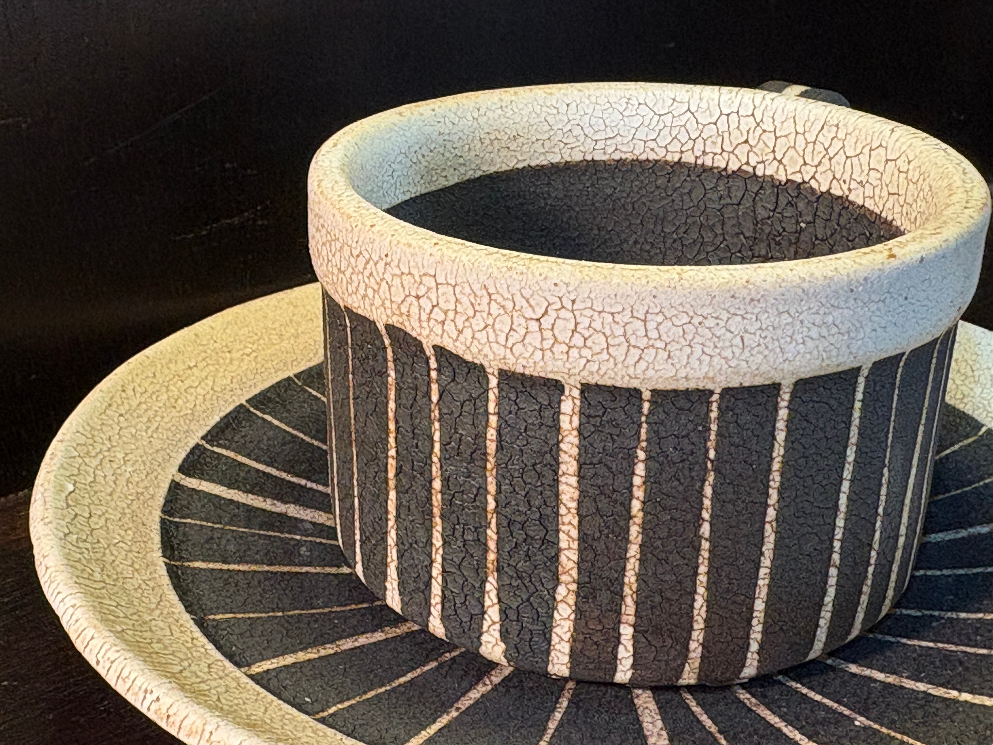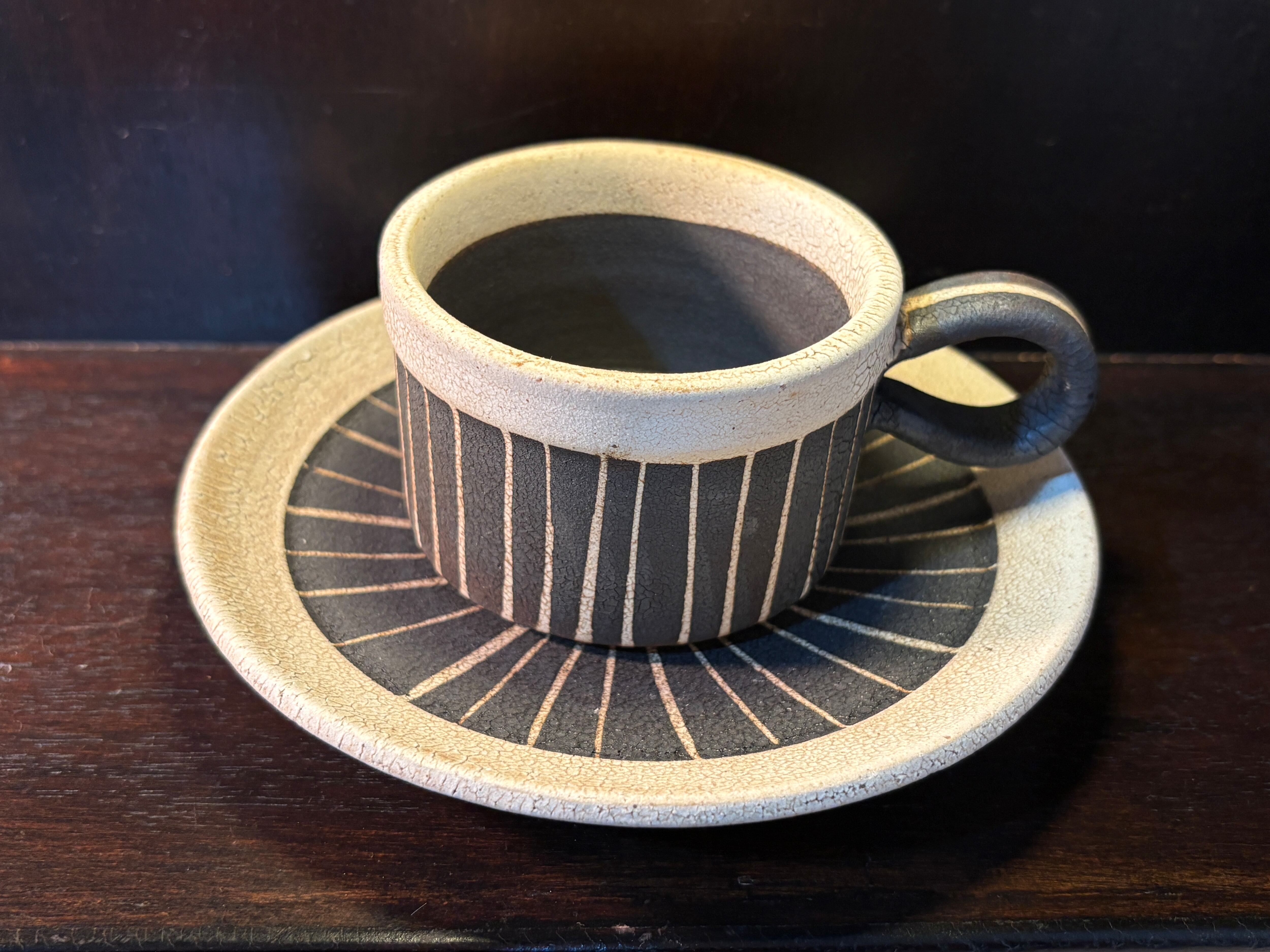 不規則なストライプ、かいらぎの質感が素敵な、やや小ぶりのカップとソーサーのセットです。
