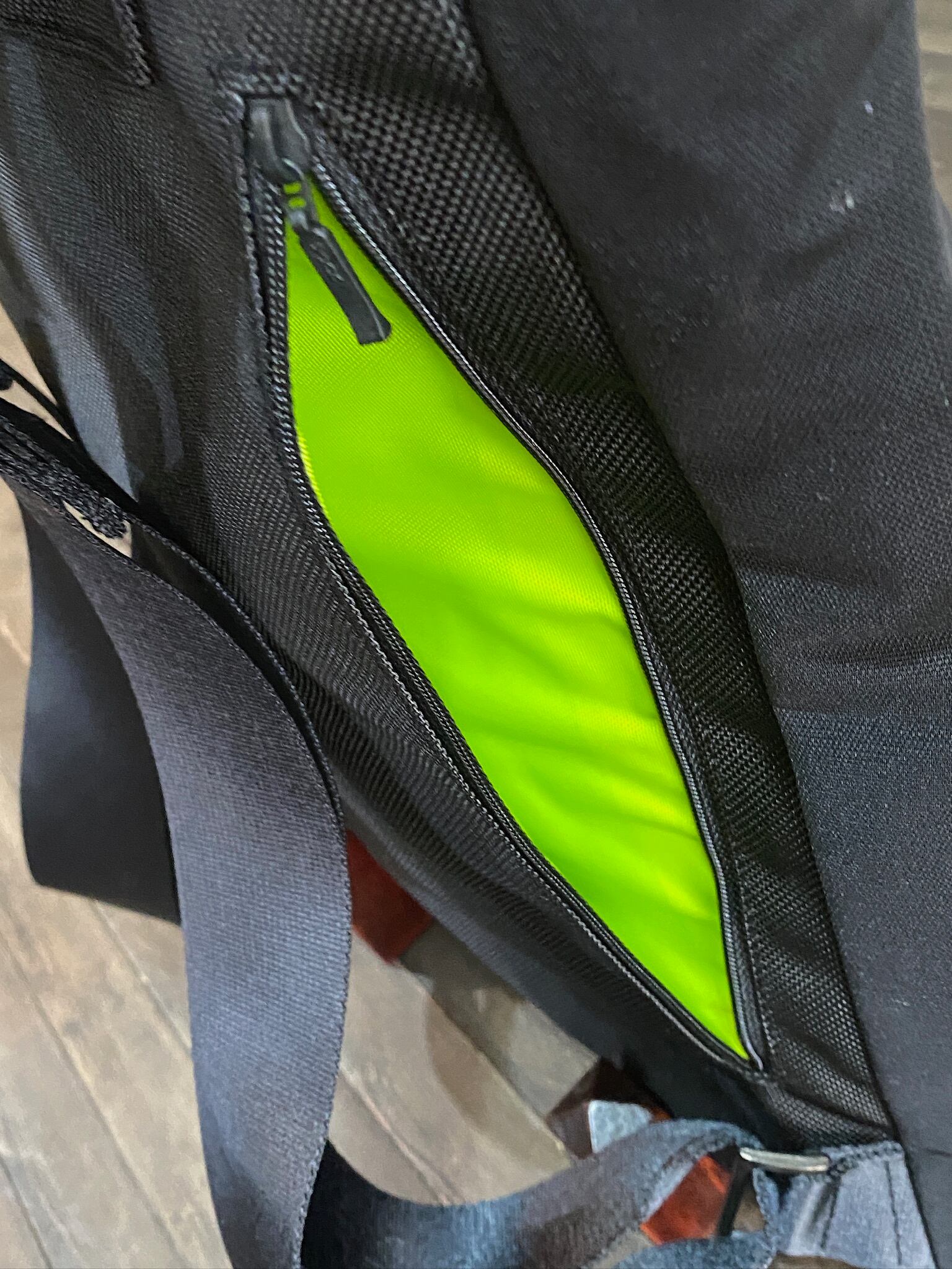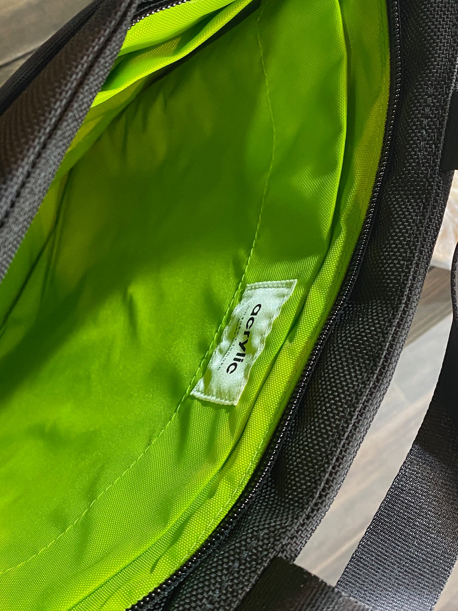 裏地は明るいライムグリーンなので物が探しやすく、ポケットもたくさんついています。